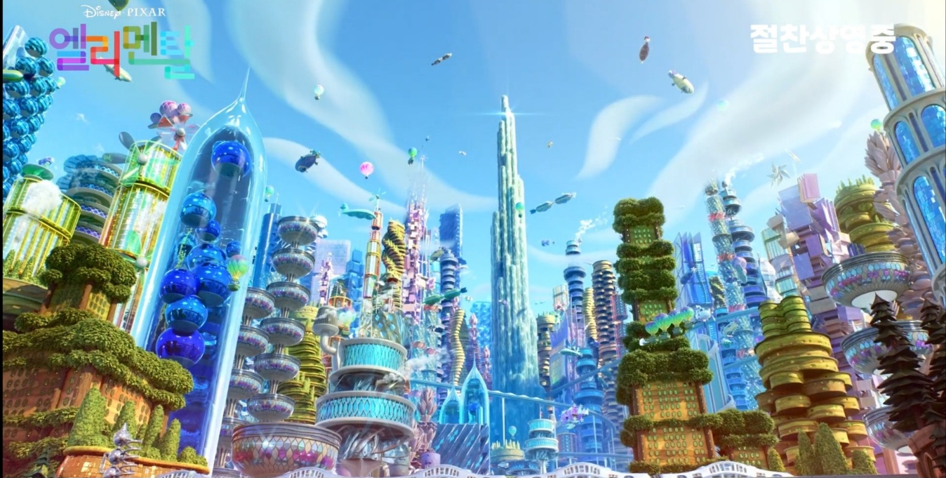 이곳은 원소의 세계 엘리멘트 입니다. 물과 불과 나무와 공기.... 물은 불을 꺼트리고, 불은 나무를 태우고.. 어찌 보면 공존할 수 없는, 생각하지 못하는 상황이긴 합니다. 어울리지 않는 원소들의 만남이 어떤 이야기를 선사할지 굉장히 기대가 되었습니다. 저는 영화를 보면서 계속 생각했습니다. '어쩜 이런 생각을 해낼까? 원소를 사람처럼 나타내어 원소들이 서로 공존하고 살아가면 섞일 수 없는 물과 불이 만나 서로 감정이 싹트고... 그러면서 말할 수 없는 변화들이 일어나고.. 가히 평범한 생각으로는 만들어 낼 수 없는 작품이라는 생각이 들었습니다. 전 뭔가를 이야기 해주는 영화를 좋아합니다.